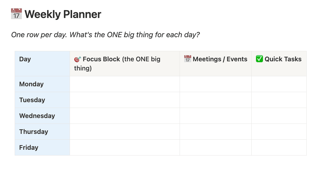 That’s it. No 40-field spreadsheet. No complicated system to learn. Just a clean, focused framework that helps you walk into Monday with a plan instead of a prayer.